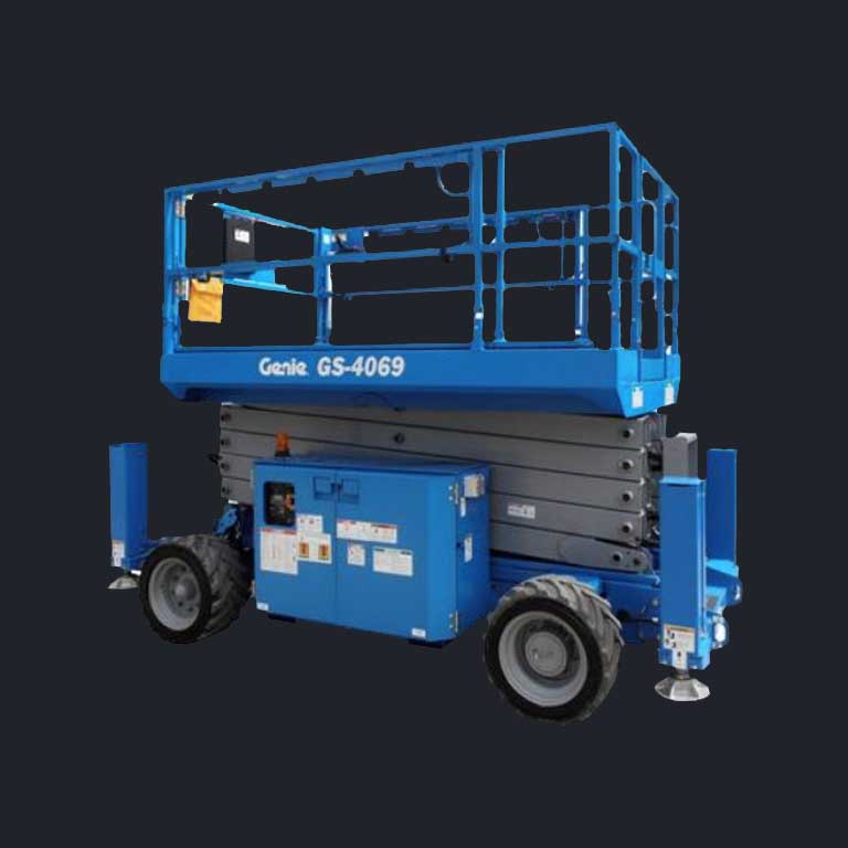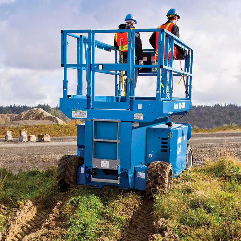 The Genie GS4069 RT rough terrain scissor lift is a tough, construction-oriented four-wheel drive machine with positive traction control — ideal for increasing productivity on demanding outdoor worksites.