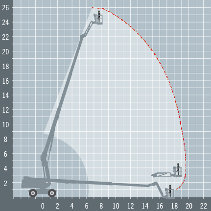 The Manitou 260TJ telescopic boom has a platform with large dimensions that can hold up to 3 operators or 400 kg. The operator is afforded a large working area due to Its rotating pendular arm (+/-70°), and continuous turret rotation capacity of 360° providing flexibility of use.