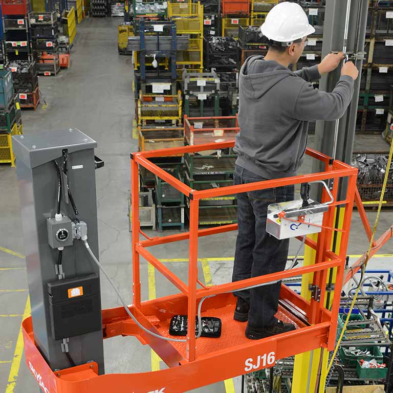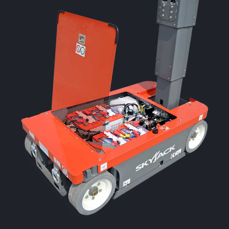 The Skyjack SJ16 Vertical Mast Lift offers an easy to service, low maintenance design in a compact and versatile package. These are zero emission, compact machines with low floor loading which means they can be used in more applications, including on finished and ornamental floors.