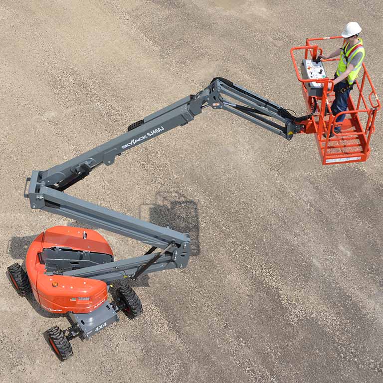 The Skyjack SJ46 is a diesel articulating boom that offers superior positive traction and terrain ability provided by the axle based 4WD system. The rear differential can be locked when negotiating rough terrain, while unlocking it improves the turning radius.